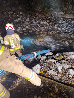 Dabei kamen zwei Pumpen zum Einsatz, die von der Ansaugstelle bei der Starkenbacher Brücke Wasser förderten.